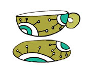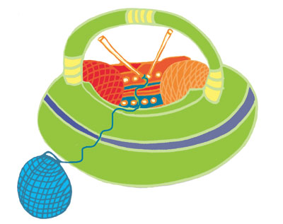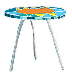 spotty armchair, knitting basket, mosaic table and blue wicker chair with cushion